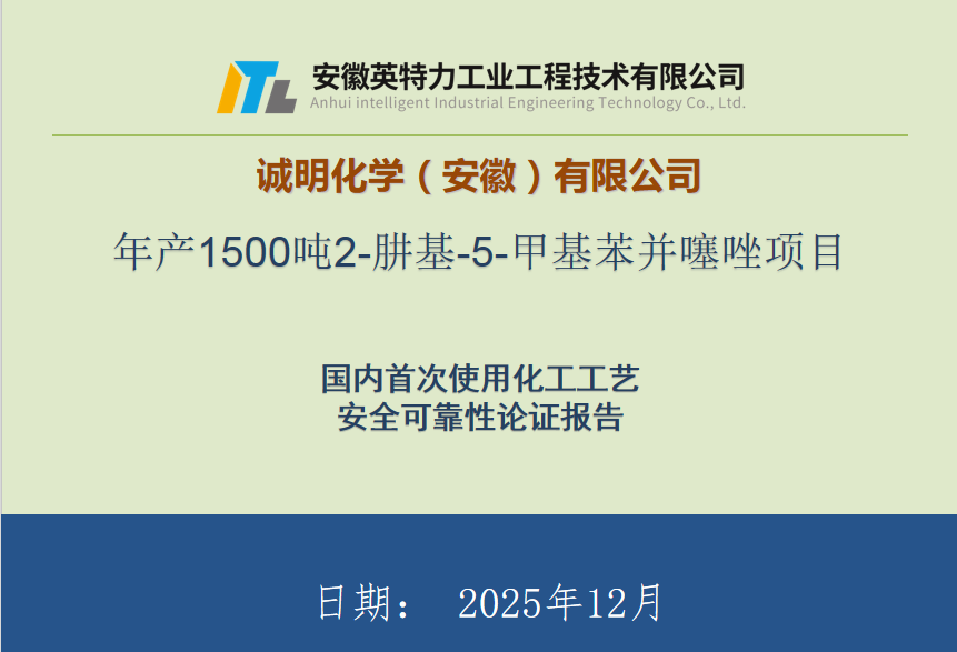 2025年12月9號(hào),根據(jù)《安徽省國內(nèi)首次使用化工工藝安全可靠性論證實(shí)施辦法》的相關(guān)規(guī)定,由安徽英特力編制的誠明化學(xué)(安徽)有限公司年產(chǎn)1500噸2-肼基-5-甲基苯并噻唑項(xiàng)目國內(nèi)首次使用化工工藝...